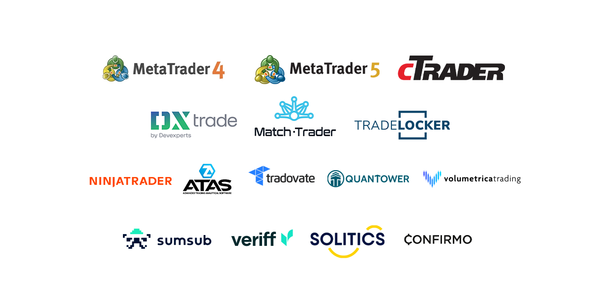 - MT4, MT5, cTrader, DXtrade, MatchTrader, TradeLocker, NinjaTrader, ATAS, Quantower, Volumetrica